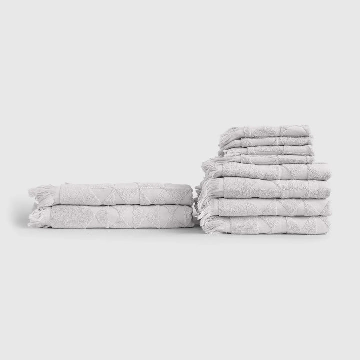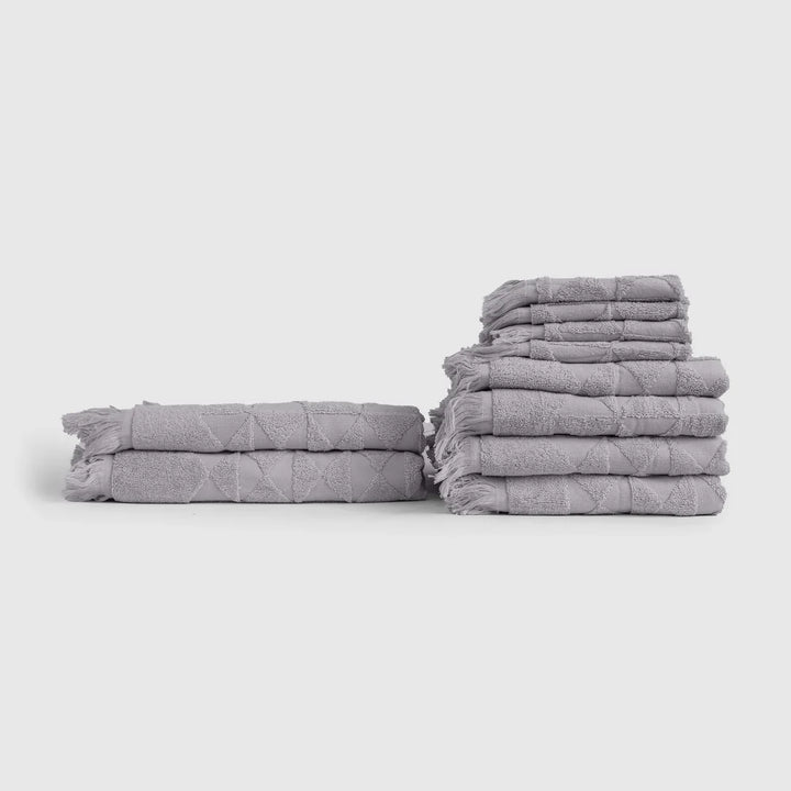 The Granda Bath Towel Set from ariika consists of 8 pieces with a simple triangle pattern and tassels at the edges.
